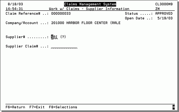 The next screen to appear is the Work with Claims - Supplier Information screen.