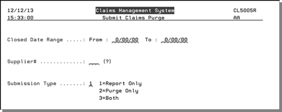 If you have the authority, you can select claims by date range and supplier to purge from the system, or you can print a report of closed claims to review before purging. Only closed claims may be purged.